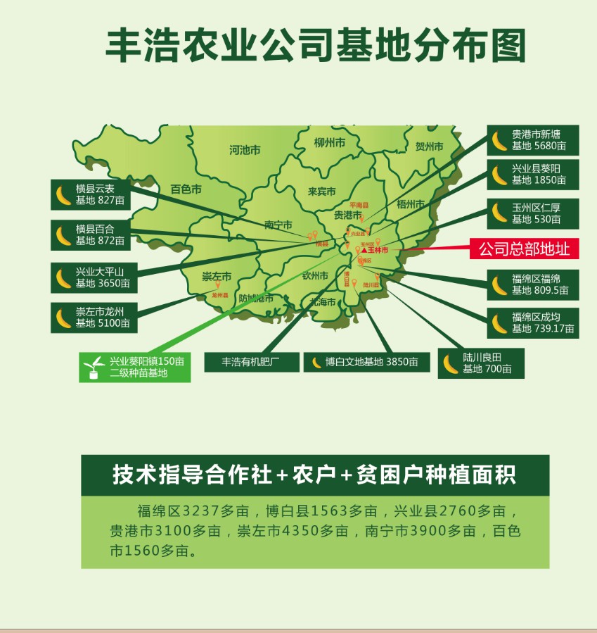 廣西豐浩農業科技有限公司是廣西參皇集團旗下一家以農業種植、種苗繁育、有機肥生產的農業公司,集團公司是農業產業化國家重點龍頭企業,公司也是玉林市農業龍頭企業的代表。致力生產品質高端、健康安全的 “金豐浩”牌香蕉、粉蕉和果蔗。其中香蕉和粉蕉已通過了國家綠色食品認證、富硒農產品認證;果蔗獲得了無公害農產品認證。公司是中國粉蕉種植規模較大,標準化較高的企業。